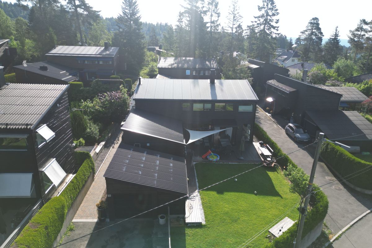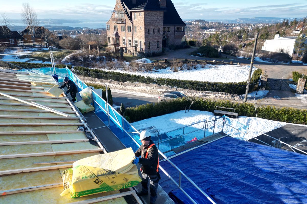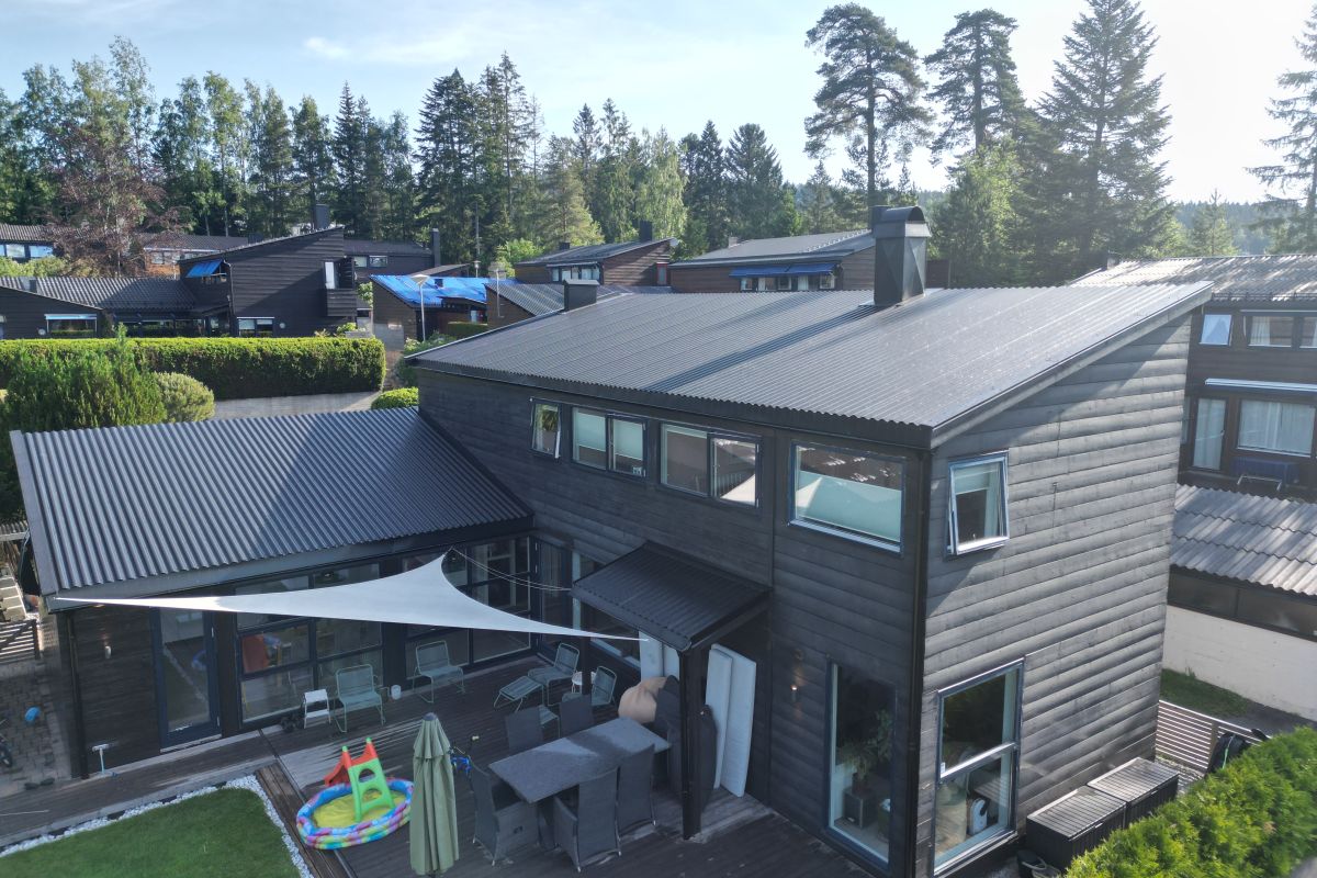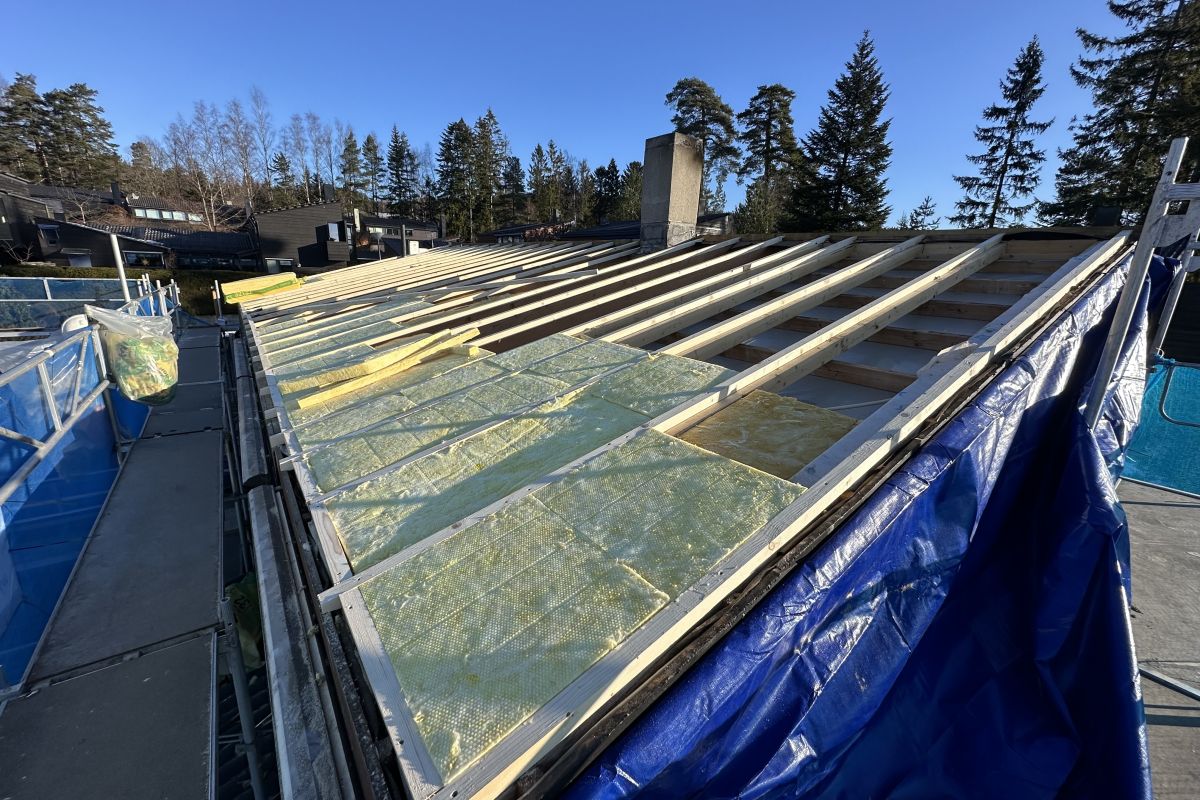 En fast kunde tok kontakt med oss etter å ha oppdaget vannlekkasje fra taket. Vi åpnet opp konstruksjonen og lokaliserte områdene med fuktskader. Skadene var omfattende nok til at det lønte seg å bytte hele taket. Vi bygde det opp på nytt med isolasjon, gjennomgående luftespalter for god ventilasjon, nytt undertak, sløyfer og lekter. Til slutt monterte vi nye takplater, beslag, renner og nedløp.