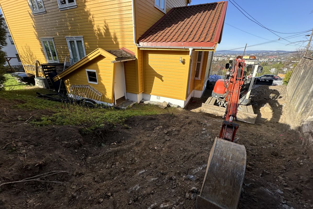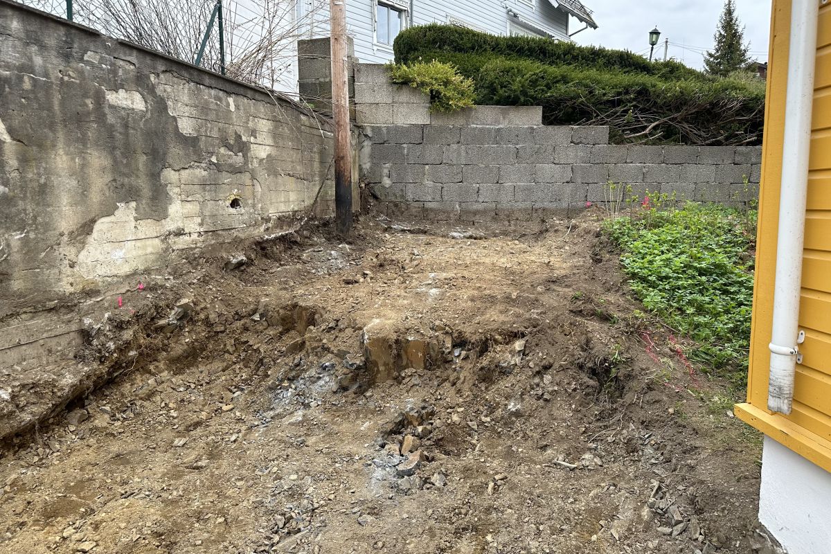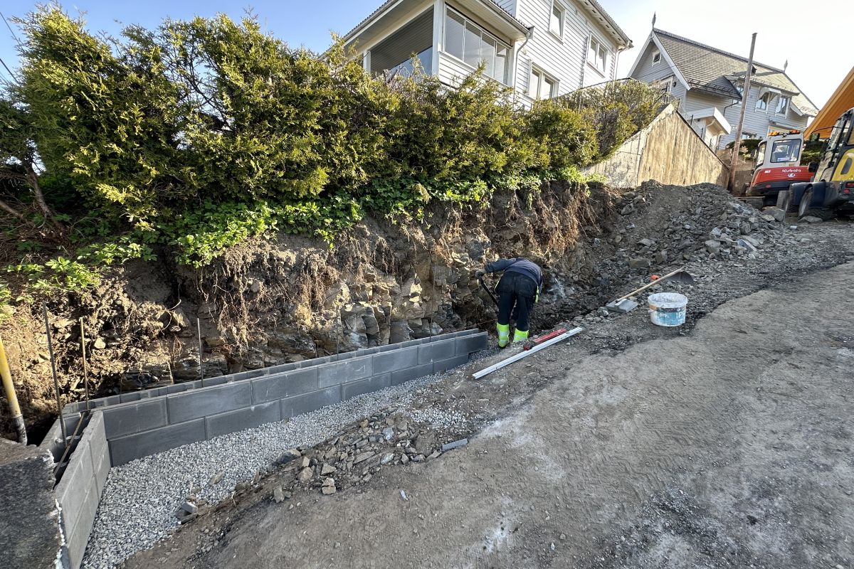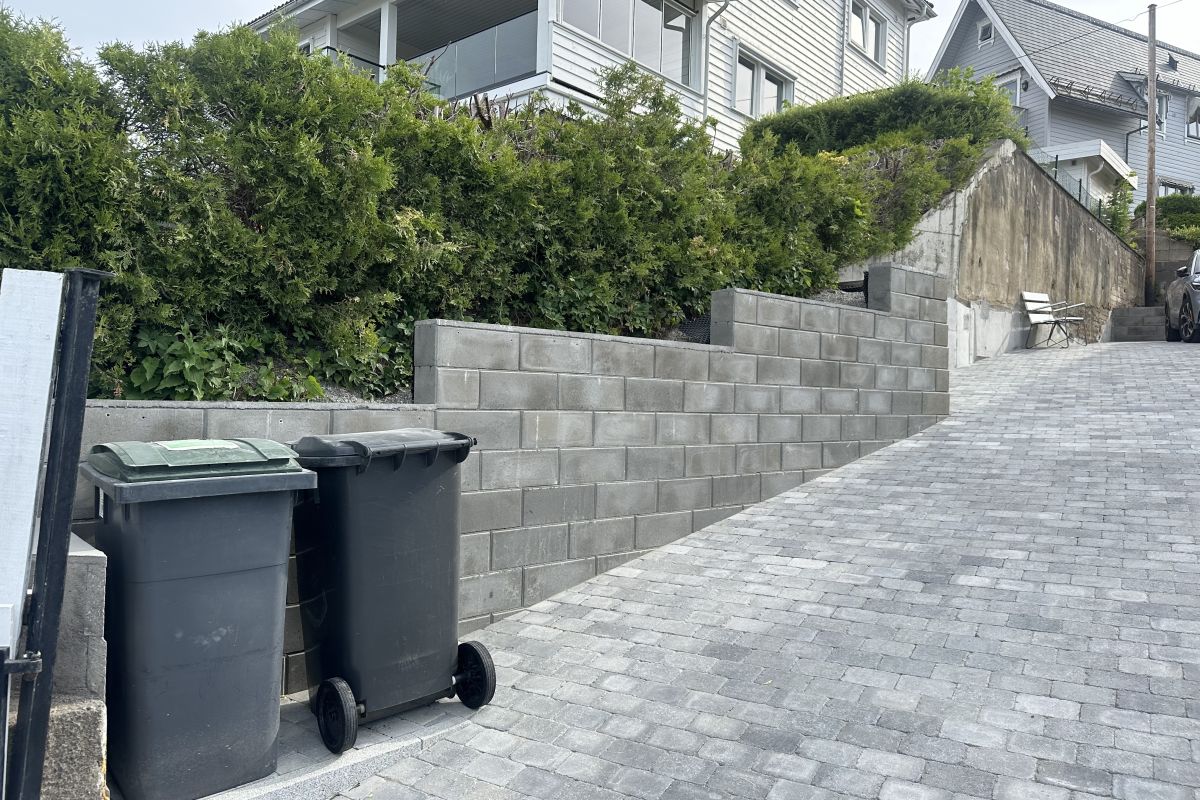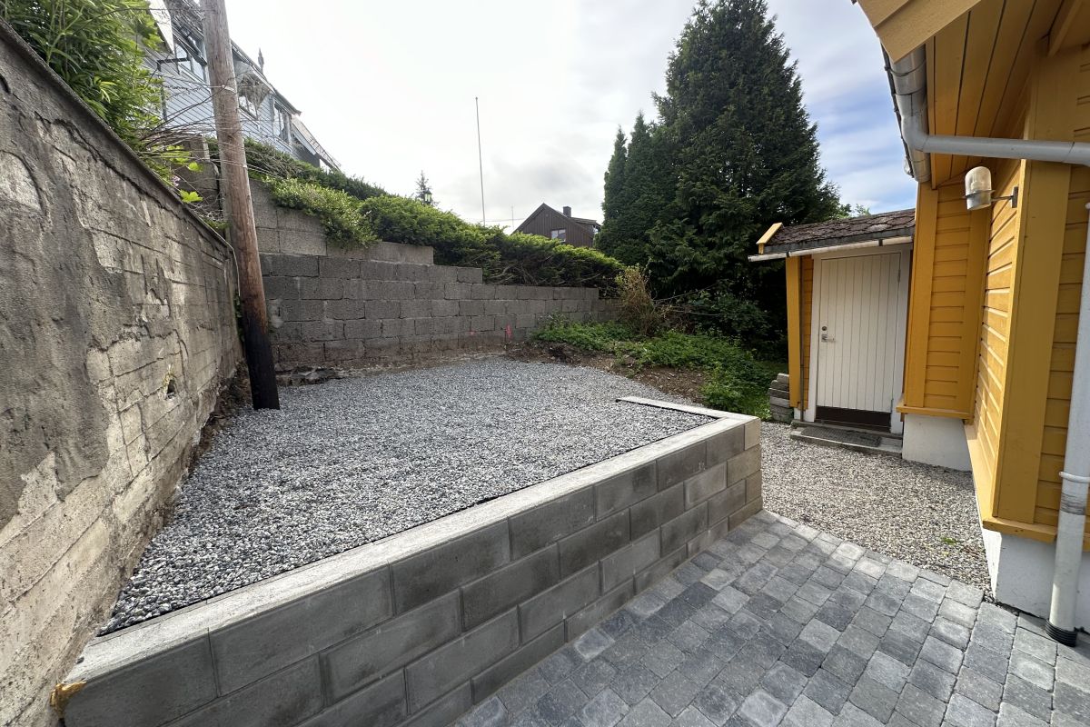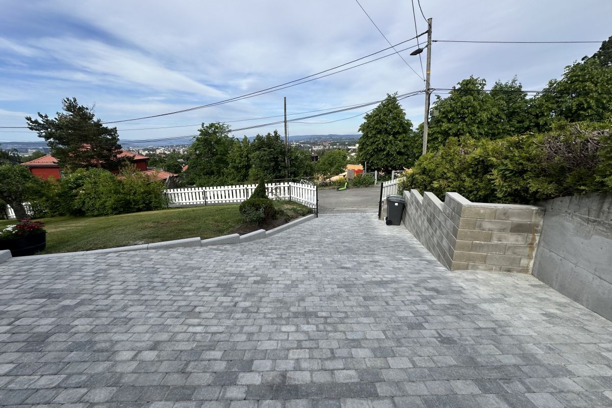 På Grefsen forvandlet vi en vanlig innkjørsel til nabolagets blikkfang. Vi startet med full masseutskiftning for å gi belegningssteinen et stabilt og varig fundament. Deretter la vi belegningsstein rammet inn av kantstein, og støpte en solid forskalingsblokk mur som avgrenser mot nabotomten.