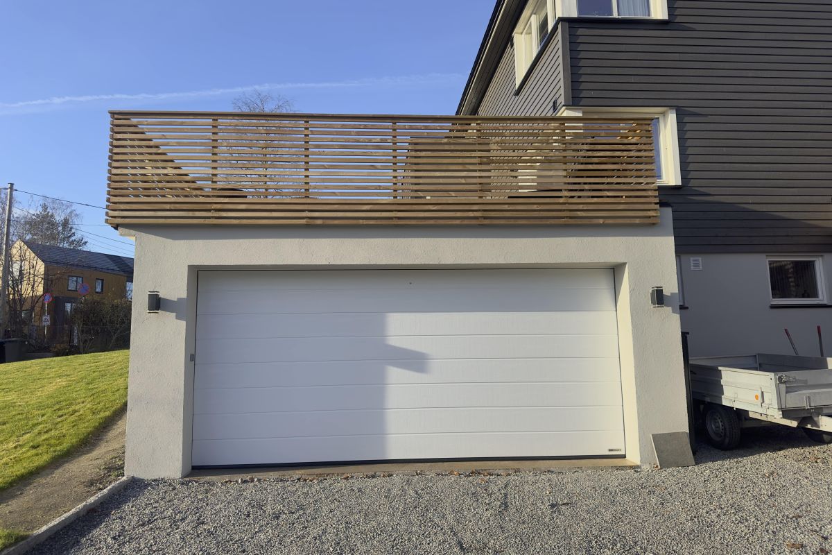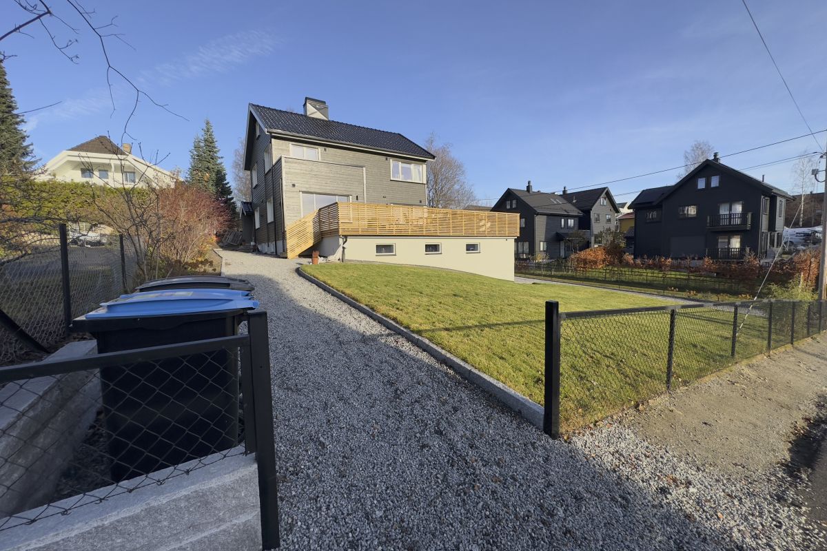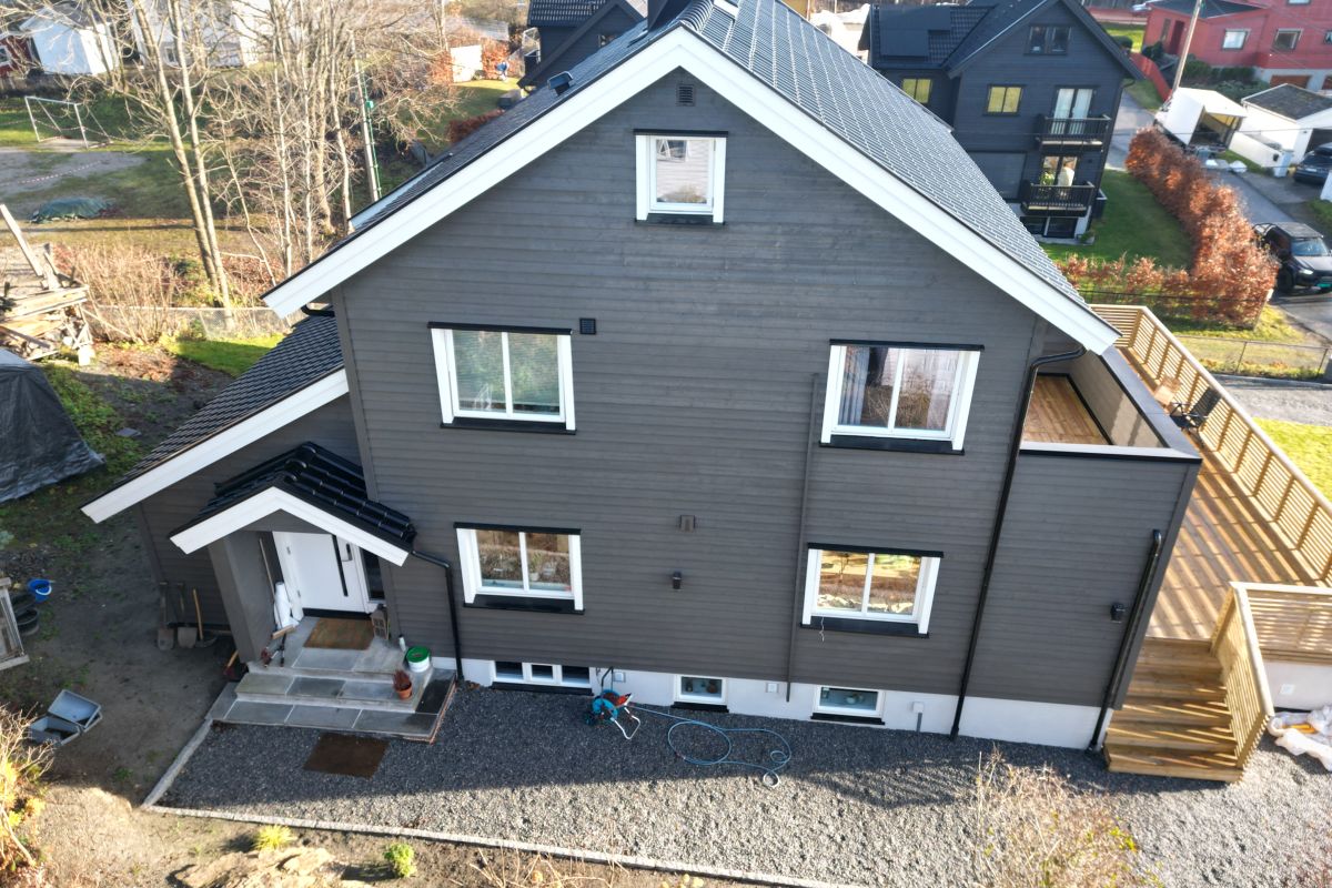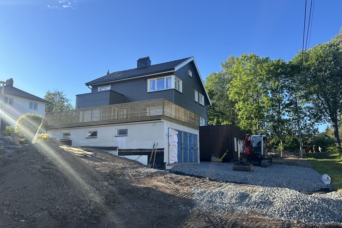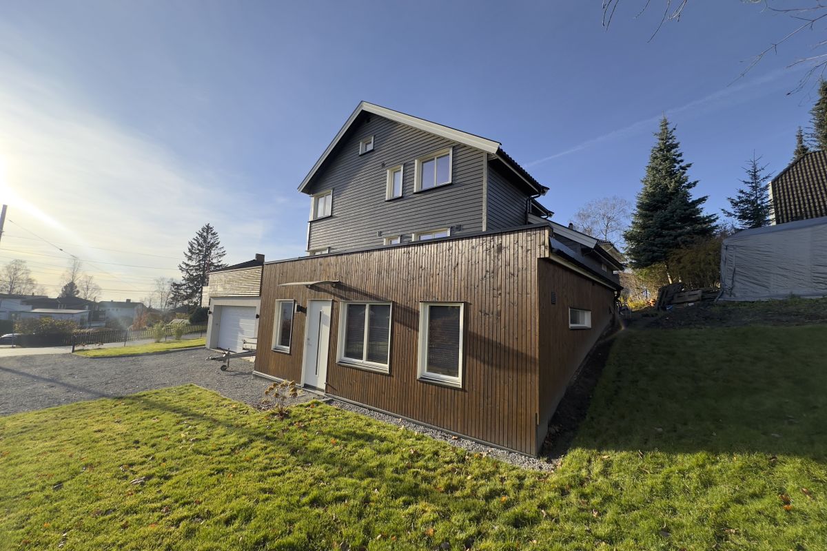 Her på Røa har vi gitt denne eneboligen en solid oppgradering fra grunn til topp. Vi gravde ut deler av kjelleren og bygde en fullverdig garasje, samtidig som vi oppførte et tilbygg med egen hybel og separat inngang. På toppen av garasjen etablerte vi en stor terrasse med fantastiske solforhold – et perfekt uteområde med god utsikt. Fasaden ble etterisolert, fikk nytt panel og flott farge. Vi la ny takstein, planerte hagen og bygde en ny innkjørsel som gir enklere adkomst. Resultatet er bedre komfort, praktiske løsninger og et helhetlig løft for eiendommen.